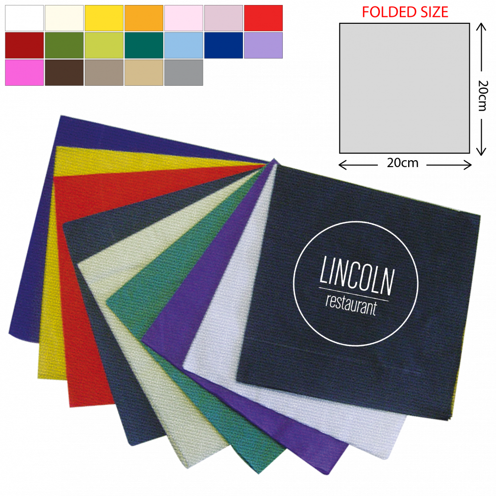We have a selection of popular printed napkin sizes for you to choose from 24x24cm, 33x33cm and 40x40cmIdeal for weddings, hotels and restaurants to add that personal touch.